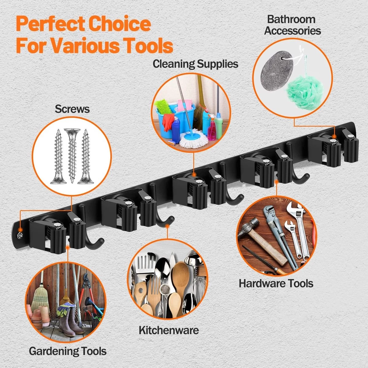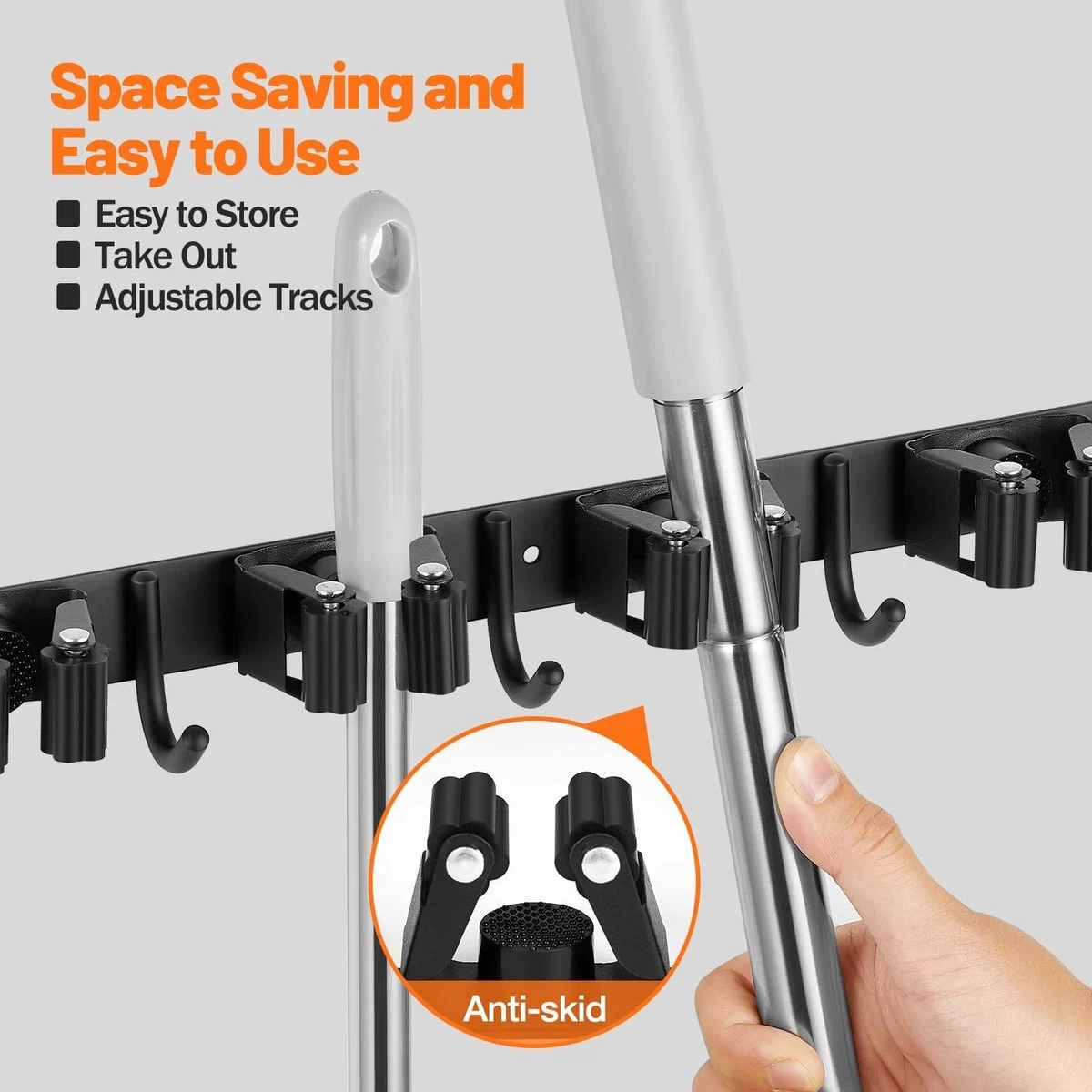Mop- en bezemhouder-muurbevestiging: Deze bezem-organizer-muurbevestiging is geschikt voor het organiseren van uw schoonmaakbenodigdheden, tuingereedschap, sportartikelen, keukengerei, badkameraccessoires en hardwaregereedschap. De bezemhouder is de beste metgezel in je keuken, badkamer, garage en wasruimte, zelfs in de schuur van je tuin, houd je werkruimte schoon en netjes.