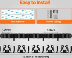 Ruimtebesparend en gemakkelijk te gebruiken: Met 5 rekken en 6 haken biedt deze bezemhouder-muurbevestiging in totaal 9 ophangposities voor uw gereedschap, waardoor uw ruimte maximaal wordt bespaard. Zodra u de bezemsteel in de driehoekige clip klemt, past deze automatisch in de verschillende diktes van de handgrepen en vergrendelt deze zonder te schuiven. Dankzij de siliconen tandwielrol kun je hem er gemakkelijk uithalen door de handgrepen op te tillen.