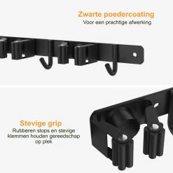 Met een lengte van slechts 38cm plaats je de bezemhouder zonder problemen op de kleinste plekken. En met 3 klemmen en 4 haken heb je voldoende ruimte voor de meest gangbare hulpmiddelen.